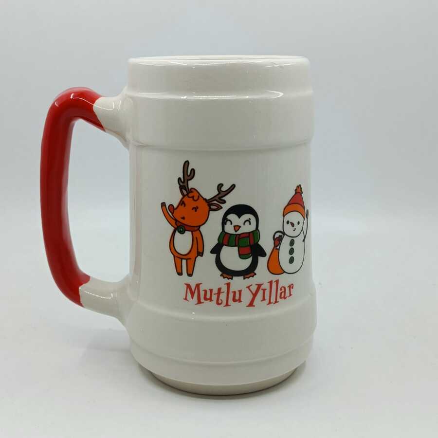 GEYİK PENGUEN KARDANADAM MUTLU YILLAR-SERAMİK BİRA BARDAĞI - KIRMIZI SAP