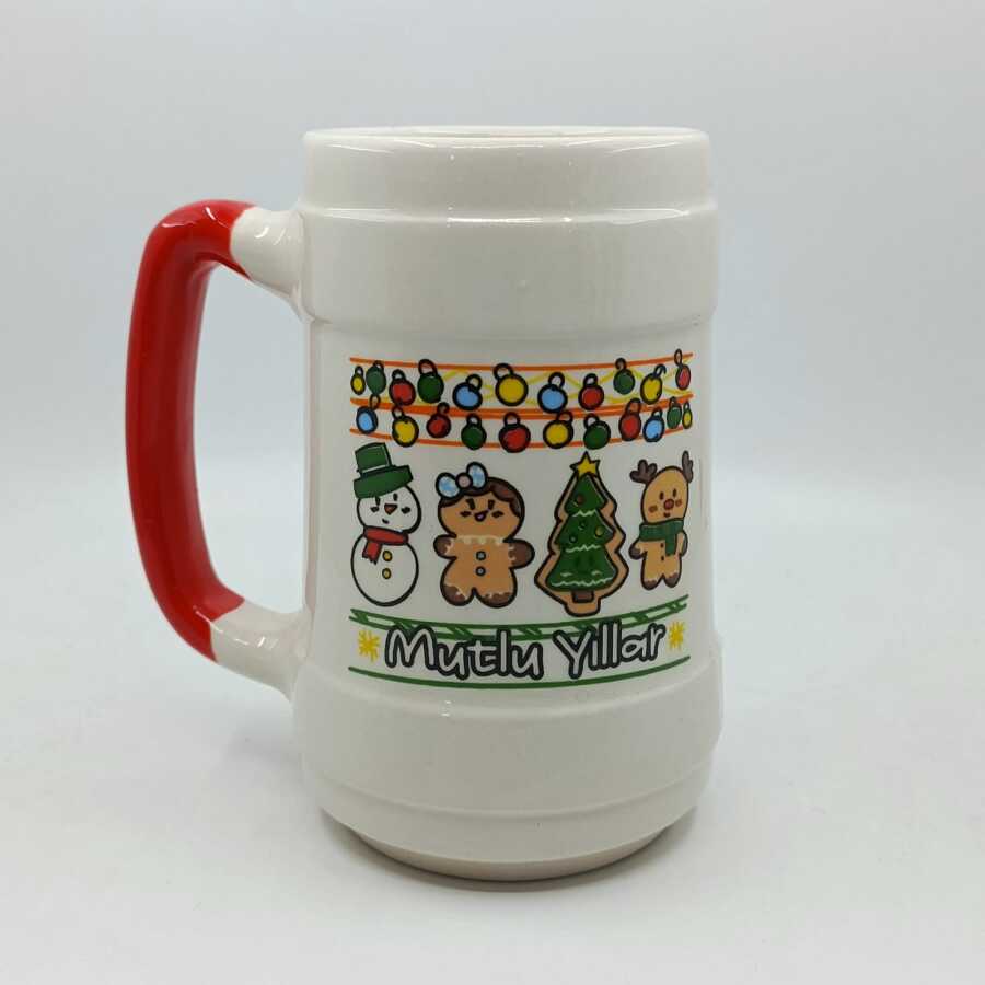 IŞIKLI KURABİYE ADAMLAR MUTLU YILLAR-SERAMİK BİRA BARDAĞI - KIRMIZI SAP