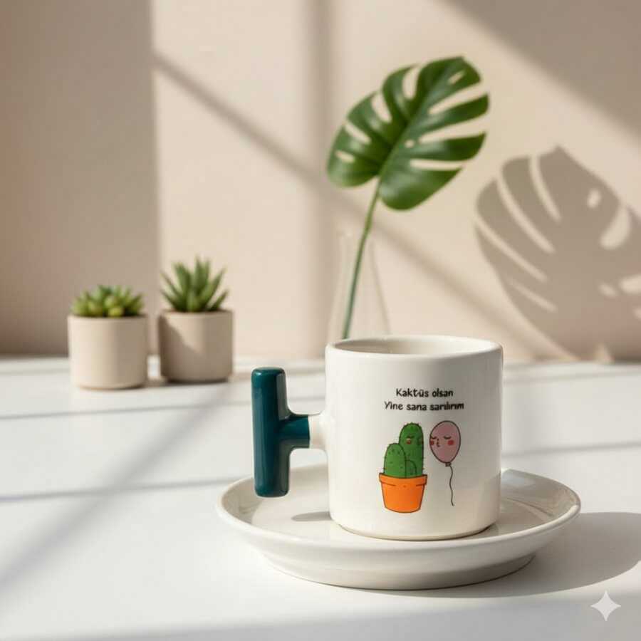 KAKTÜS OLSAM YİNE SANA-T TÜRK KAHVESİ FİNCANI - YEŞİL SAP