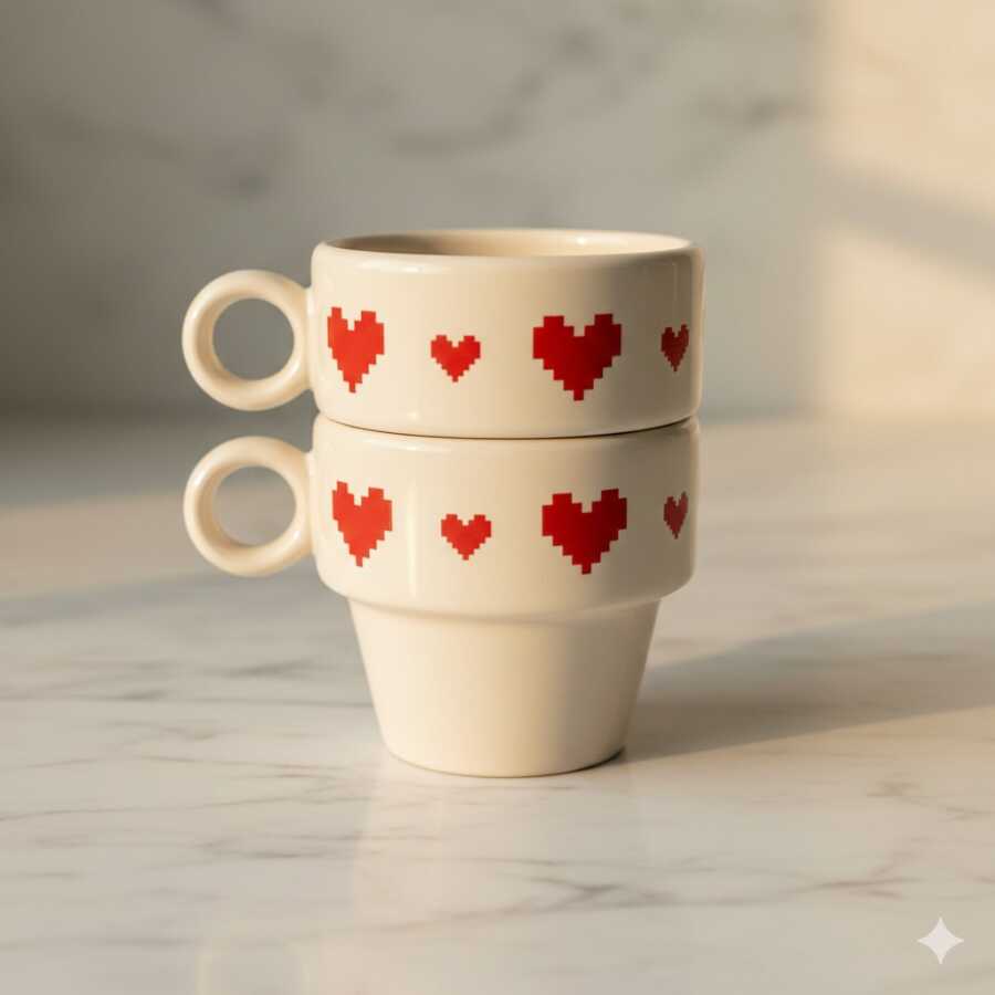 KIRMIZI PİKSEL KALPLER-İKİLİ ESPRESSO BARDAĞI - TRANSPARAN