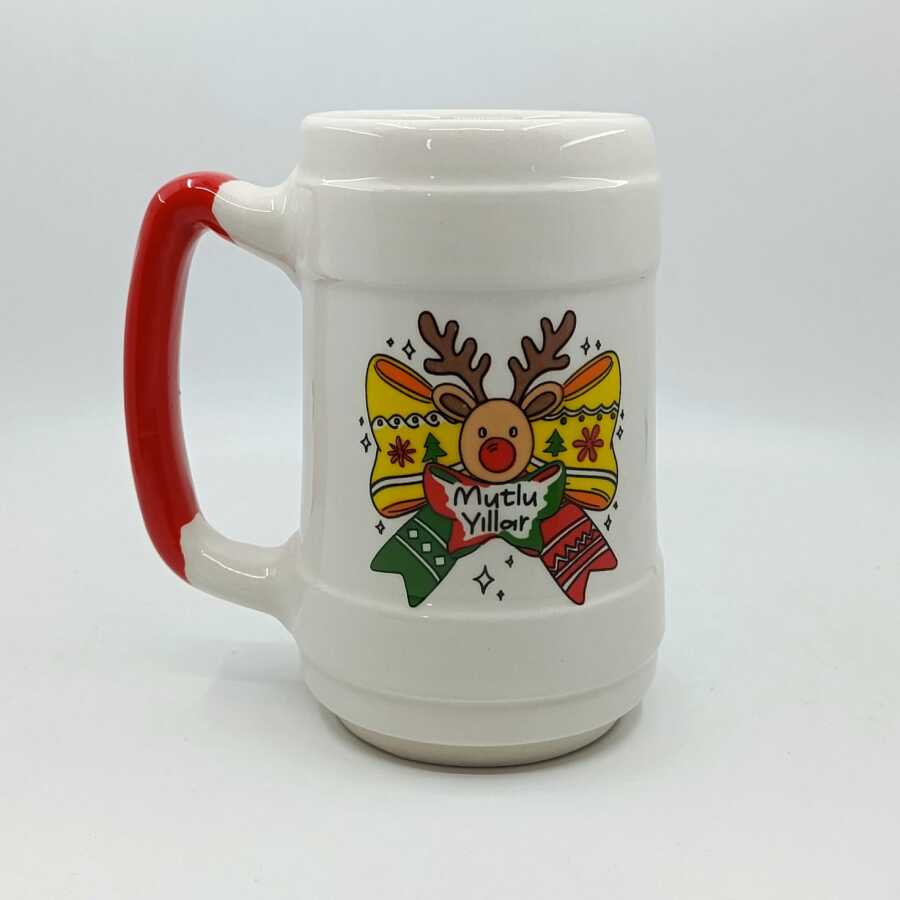 MİNİK GEYİK MUTLU YILLAR-SERAMİK BİRA BARDAĞI - KIRMIZI SAP