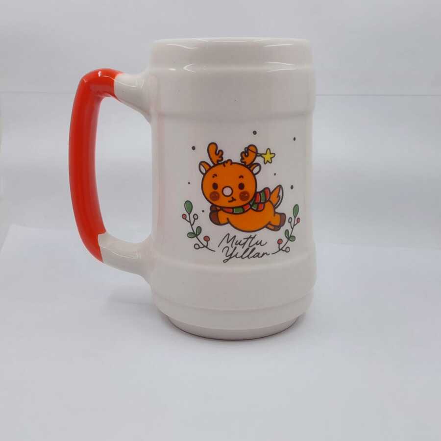 MİNİK GEYİK MUTLU YILLAR-SERAMİK BİRA BARDAĞI - KIRMIZI SAP