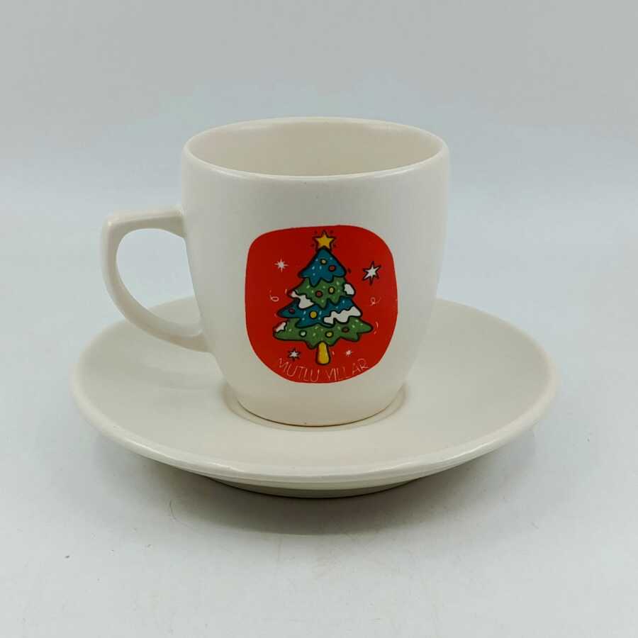 NOEL AĞAÇ KIRMIZI FON MUTLU YILLAR-KLASİK TÜRK KAHVESİ FİNCANI - TRANSPARAN GÖVDE
